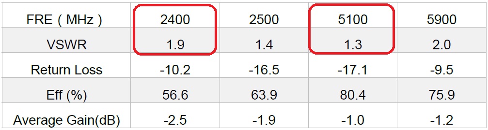 براساس جدول مقادیر تست شده VSWR این آنتن از لحاظ الکتریکال، همه باندهای فرکانسی بازه ذکر شده را به خوبی و با کیفیت مناسبی پوشش می دهد.